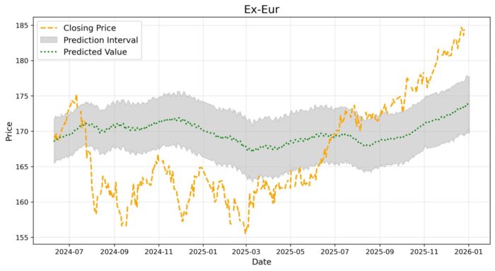 • 翌週の5日間の予測値と実際の取引値の比較をグラフに表しています。