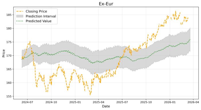 • 翌週の5日間の予測値と実際の取引値の比較をグラフに表しています。