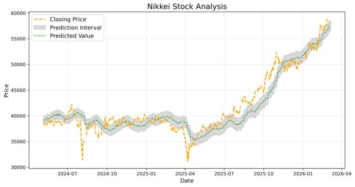 - 灰色の帯の下限が予測の下限、上限が予測の上限を表しています。