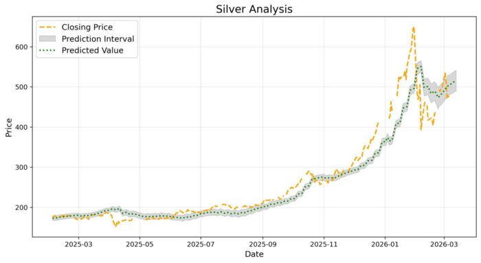 - 灰色の帯の下限が予測の下限、上限が予測の上限を表しています。