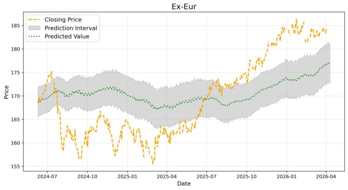 • 翌週の5日間の予測値と実際の取引値の比較をグラフに表しています。